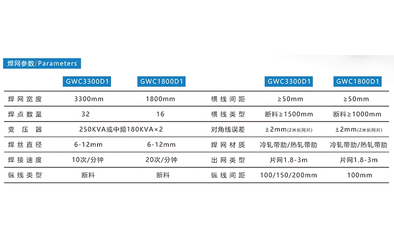 鋼筋網(wǎng)焊接生產(chǎn)線,焊接網(wǎng)寬度3300mm和1800mm兩種,焊接絲徑6-12mm,焊接速度分別為10次/分鐘和20次/分鐘,縱橫線均為斷料。標準配置:縱線托絲平臺、焊接主機、增料料斗、伺服拉網(wǎng)??蛇x配置:空壓機、工業(yè)冷水機、橫線自動折彎+出網(wǎng)小車、縱線自動折彎+出網(wǎng)小車、出網(wǎng)托輥。河北驕陽焊工有限公司,0318-7063097