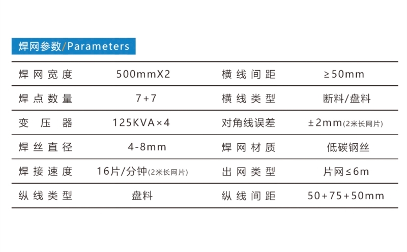 ALC是蒸壓加氣混凝土(Autoclaved lightweight Concrete)的簡稱,它是以石英砂或粉煤灰、水泥、石灰等為主原料,內(nèi)配雙層雙向冷拔絲鋼筋網(wǎng)片,經(jīng)過高溫蒸汽養(yǎng)護而成的多氣孔混凝土成型板材;既可做墻體材料,又可做屋面板、樓層板、外墻造型,是一種性能優(yōu)越、安裝簡便、靈活的成熟建材。雙片加氣板網(wǎng)片焊接生產(chǎn)線,可以高效率地自動焊接ALC所需的鋼筋網(wǎng)片。焊點數(shù)量7+7個,焊網(wǎng)寬度500mm×2,焊接絲徑4-8mm,每分鐘約焊接16片。標準配置:放線盤、縱線盤絲入料模塊、伺服送網(wǎng)、橫線雙片料斗、焊接主機、剪網(wǎng)機、簸箕式落網(wǎng)。可選配置:橫線盤料、出網(wǎng)小車、簡易循環(huán)冷卻器、空壓機。河北驕陽焊工有限公司,0318-7063097
