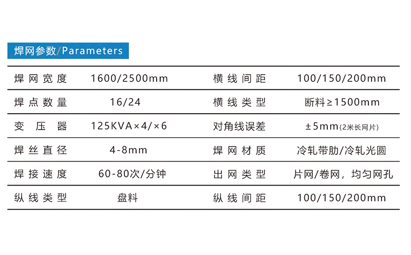 鋼筋網(wǎng)焊接生產(chǎn)線,焊接網(wǎng)寬度1600mm/2500mm,焊接絲徑4-8mm,焊接速度為60-80次/分鐘,縱線為盤料,橫線為斷料。標(biāo)準(zhǔn)配置:放線盤、縱線緩料、校直、叼絲、儲(chǔ)料、伺服送網(wǎng)、增料料斗、剪網(wǎng)、出網(wǎng)托架??蛇x配置:簸箕式輸網(wǎng)與落網(wǎng)、快速拉網(wǎng)+升降式輸網(wǎng)與落網(wǎng)、自動(dòng)翻網(wǎng)、空壓機(jī)、自動(dòng)卸網(wǎng)卷網(wǎng)機(jī)、冷水機(jī)。河北驕陽(yáng)焊工有限公司,0318-7063097