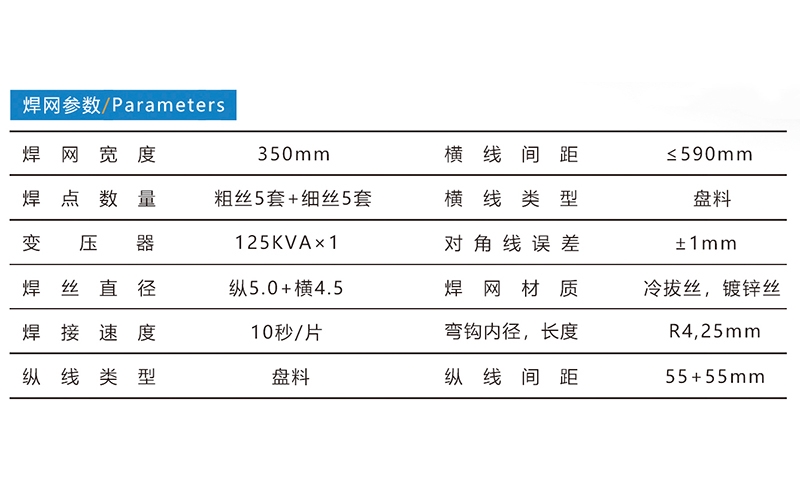 養(yǎng)殖網(wǎng)層疊籠門焊接生產(chǎn)線,焊網(wǎng)寬度350mm,焊接絲徑5.0+4.5mm,焊接速度為10秒/片,橫線縱線均為盤料。標(biāo)準(zhǔn)配置:放線盤、縱線入料系統(tǒng)、橫線入料系統(tǒng)、焊接主機、自動折彎、自動剪網(wǎng)、接網(wǎng)架。可選配置:冷水機。河北驕陽焊工有限公司,0318-7063097